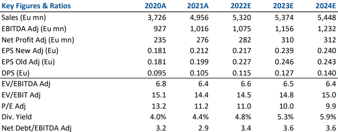 Riduciamo leggermente i nostri numeri di previsione su EPS 2022-2023 in media del 3,5% per maggiori D&A e oneri finanziari (l'EBITDA medio è invariato). Il nostro target price passa da 3.30 a 3.00 euro sulla scia delle nuove stime e dell'ERP più elevato (dal 5,0% al 5,5%) ed è ancora calcolato come media del DCF e dei multipli di mercato. Raccomandazione confermata.