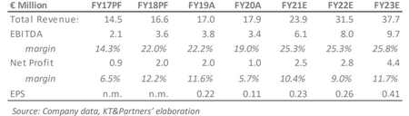 Gli analisti hanno limato leggermente le stime sui ricavi 2021 (da 24,9 milioni a 23,9 milioni) per tenere in conto del risultato inferiore alle attese, ma lasciano invariate quelle sull'Ebitda. Per il 2022-23, hanno mantenuto le stesse stime sui ricavi e sulla profittabilità.