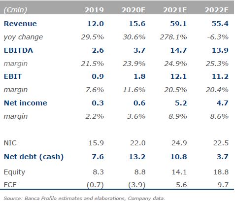Nel 2020, i ricavi dovrebbero attestarsi a 15,6 milioni, per passare a 59,1 milioni nel 2021, con un rialzo del +278% circa.