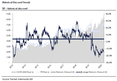 Il titolo tratta rispettivamente al 20% e al 14% di sconto sul Nav dinamico e sul market price Nav.