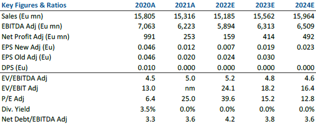 - Risultati 2021 in linea con le nostre attese e con quelle di consensus sulle principali metriche di P&L, con Adjusted EBITDAaL a 4.36 mld sul business domestico e debito netto consolidato a 17.57 mld (3.3x), in linea con le indicazioni del profit warning di dicembre. Accantonamento a fondo rischi per 548 mln relativo al contratto con DAZN per le tre stagioni calcistiche 2022-24.