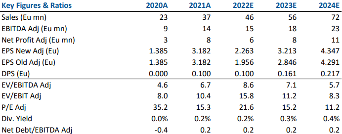 Le nostre stime sul 2022-24 si collocano in linea con gli obiettivi correnti al 2024 (ricavi a 65-79 mln, EBITDA a 19-23 mln, Capex di 40 mln cumulato nel triennio).