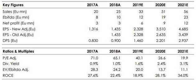 Stimiamo una crescita dell’Ebitda di 3,3-4 milioni di euro dal 2020-21 (2,2-2,5 milioni prima delle sinergie) e un incremento dell’utile per azione del 33% nel 2020 e del 29% nel 2021. Il debito netto nel 2020 dovrebbe essere pari a 16,3 milioni di euro, dai precedenti 9,5 milioni di euro. Abbiamo lasciato invariate le stime sul 2019.