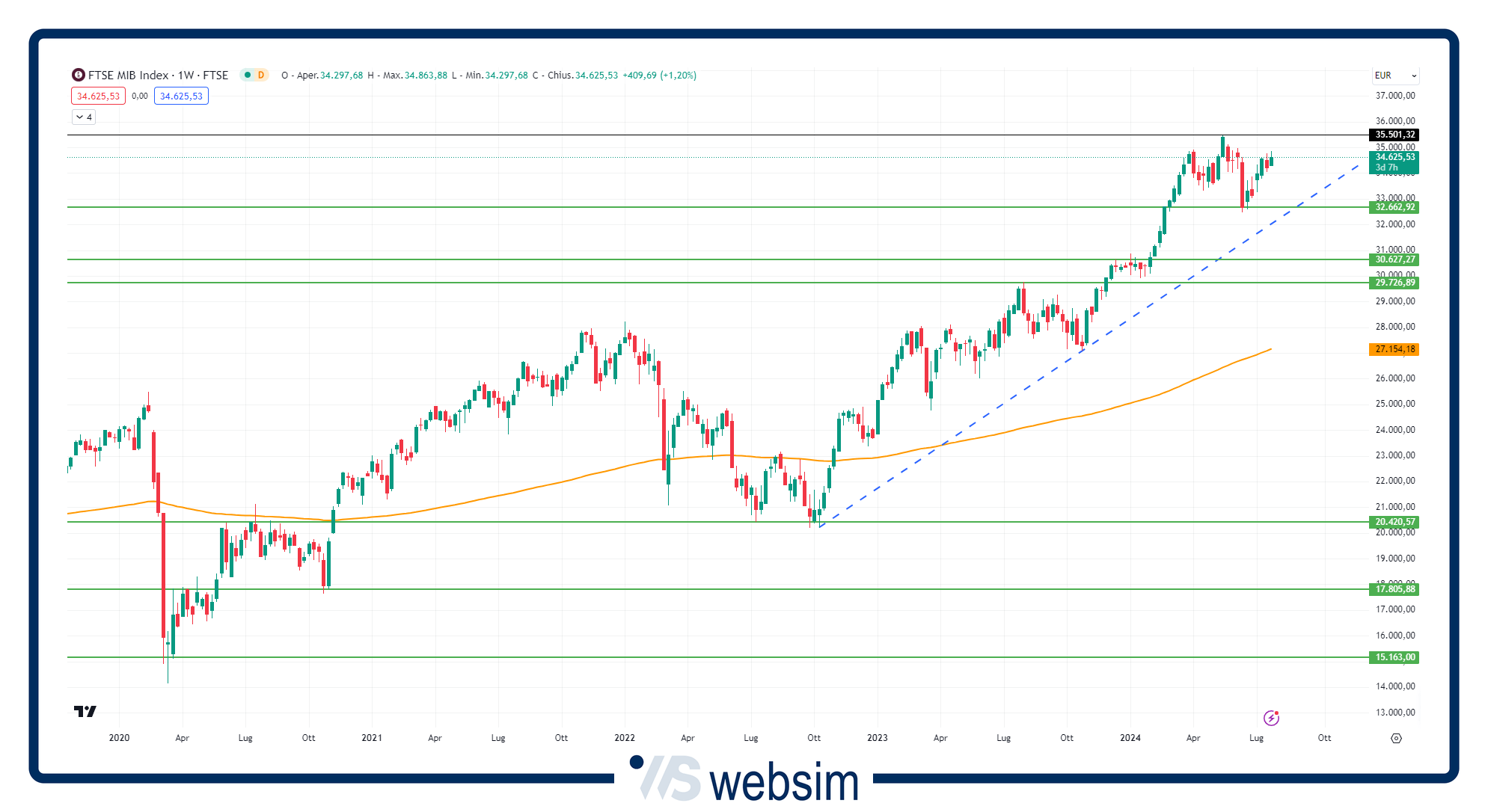 FTSEMIB (34.616 punti, 0%). Prosegue la tendenza rialzista del principale indice italiano. Graficamente, dal nuovo record di maggio a 35.474 punti (livelli massimi dal 2008) è partita una fase di ritracciamento che è stata però arginata dall'area supportiva a quota 32.500 punti, minimi di giugno. Da lì è partito un vigoroso rimbalzo e, anche se il listino dovrà superare ancora al rialzo qualche soglia tecnica per ritornare sui top di maggio, dai minimi di giugno ha già guadagnato oltre il 6% (+13% da inizio anno e +20% nell'ultimo anno di negoziazione).