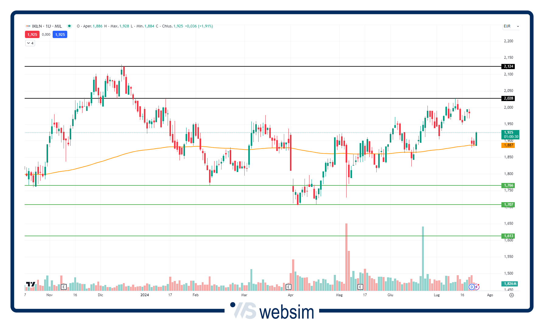 IREN [IREE.MI] (1,92 eu, Long da 1,9 eu) +1,85%. Tentativo di rimbalzo per il titolo che ricordiamo aver staccato il suo dividendo nella seduta del 22 luglio (-4,6%). Da li ha trovato supporto nei pressi di quota 1,88 eu, livello dal quale transita la media mobile a 200 giorni (linea arancione sul grafico). Un veloce recupero di quota 1,95 eu potrebbe aprire ulteriori spazi al rialzo con target iniziale verso i 2 eu.