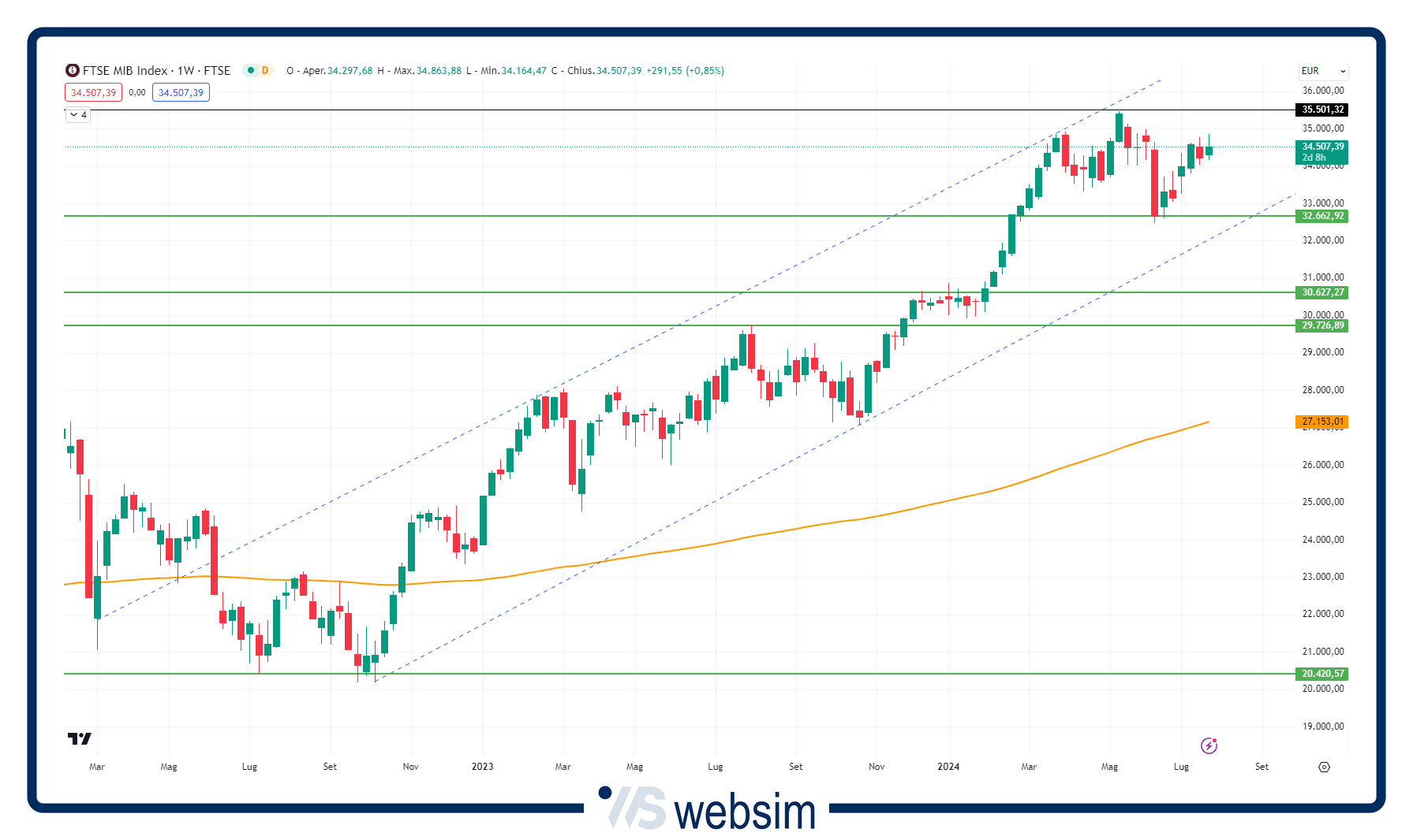 Al rialzo le principali resistenze statiche si trovano prima verso i 34.800 punti e poi quota 35.000 punti. Al contrario, qualora dovessero tornare le vendite, identifichiamo come principali aree supportive: 34.100 punti, 33.800 punti e poi la fascia 32.600-32.500 punti (minimi di giugno).