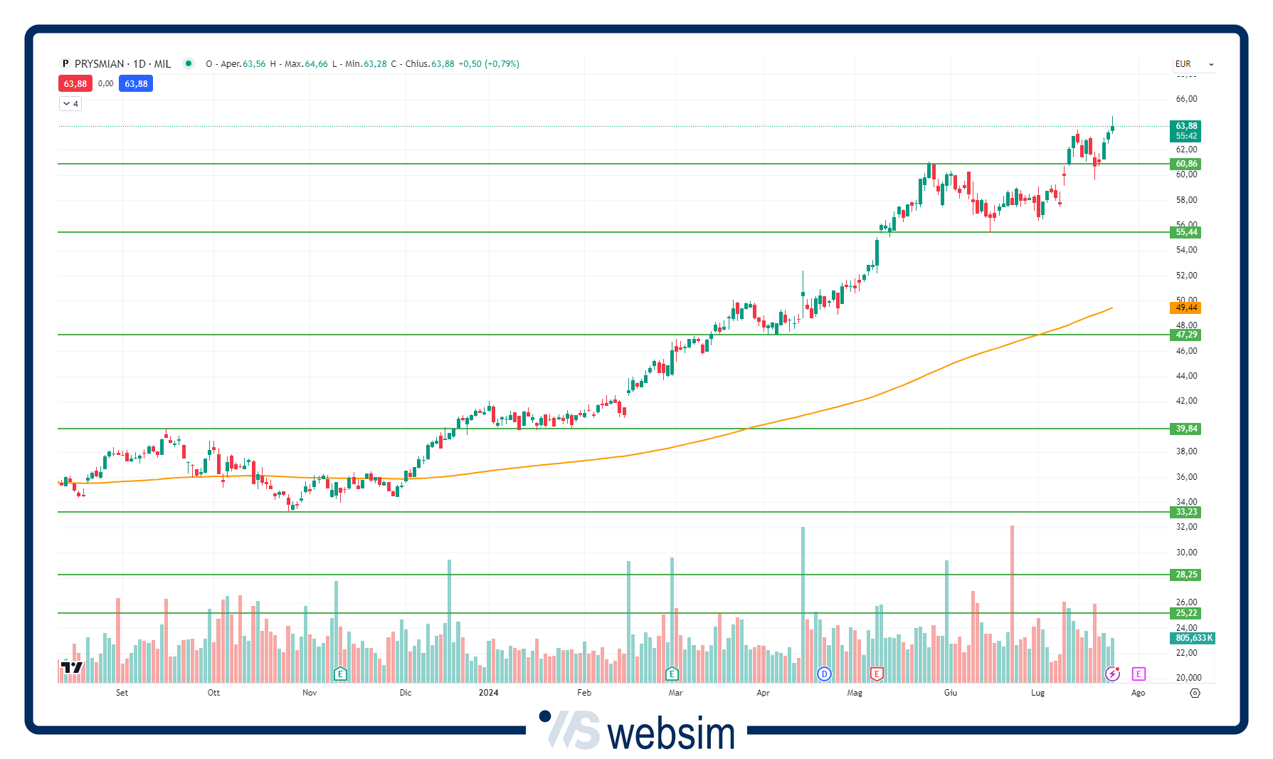 PRYSMIAN [PRY.MI] (63,5 eu, Long da 61 eu) +0,3%. Con la seduta di oggi il titolo ha raggiunto in intraday nuovi massimi storici a 64,66 eu. Il titolo ha così messo a segno il breakout dell'area di resistenza poco sopra a 63 eu, precedenti massimi segnati con la seduta del 12 luglio. La tendenza sul titolo rimane costruttiva con primo target sopra 65 eu. Rimaniamo in posizione.