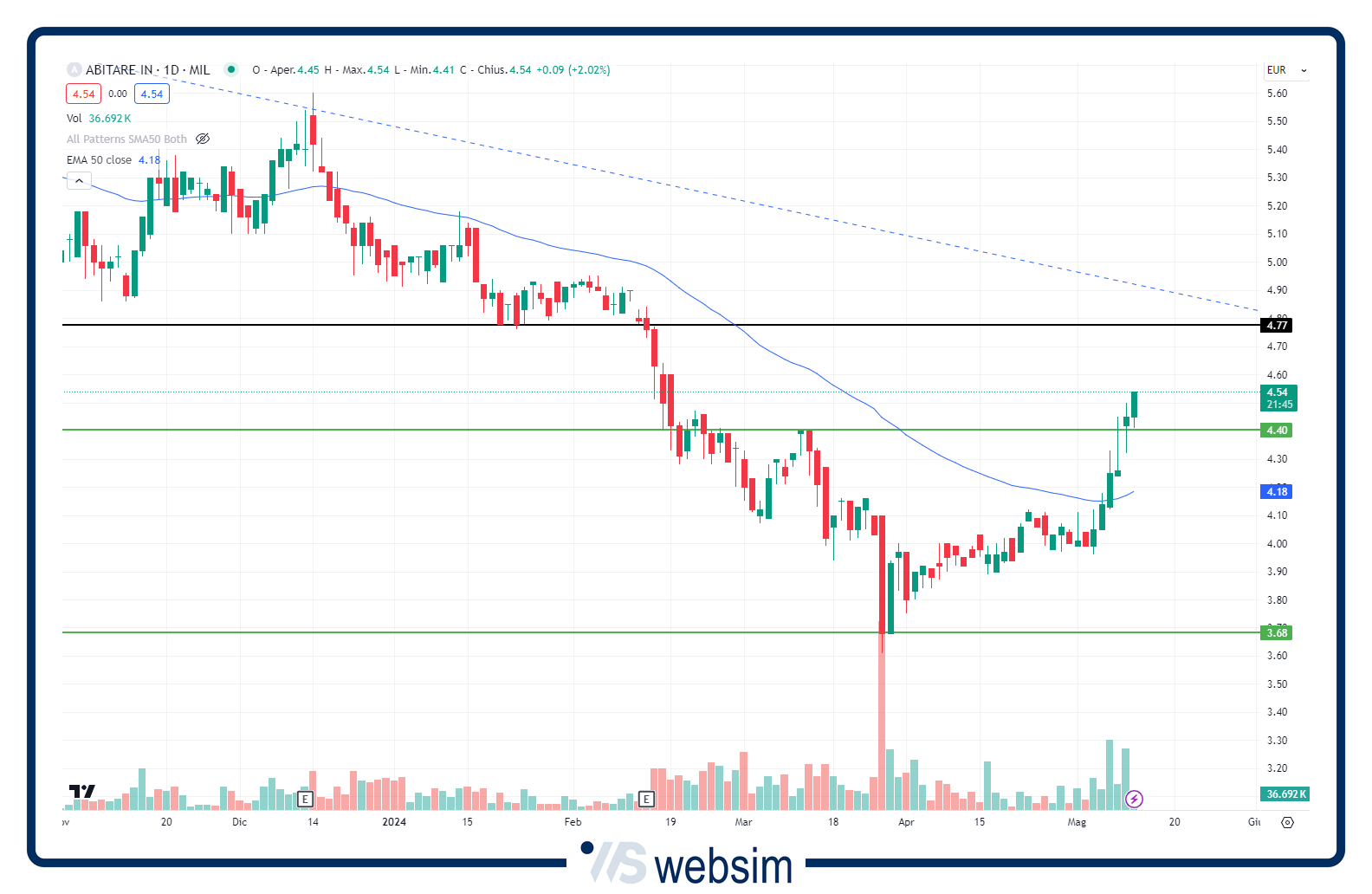 ABITARE IN [ABIT.MI] (4,5 eu, Long da 4,2 eu) +1,5%. Continua la spinta al rialzo, con il titolo che rimbalzando dall'area dei 4 euro ad azione si è riportato al di sopra della media a 100 giorni, superando al tempo stesso anche la resistenza statica a quota 4,5 eu. Ora si trova vicino a quota 4,5 eu e in caso di proseguimento della forza, un breakout confermato anche da buoni volumi di negoziazione dei 4,6 eu potrebbe favorire un allungo verso l'area dei 4,8 eu. Nonostante dai minimi di marzo evidenzi un progresso di oltre 24%, la tendenza da novembre 2021 rimane debole, ma i recenti acquisti hanno dato ulteriore conferma della solidità dell'area supportiva a quota 4 eu. Continuare a seguire la strategia.