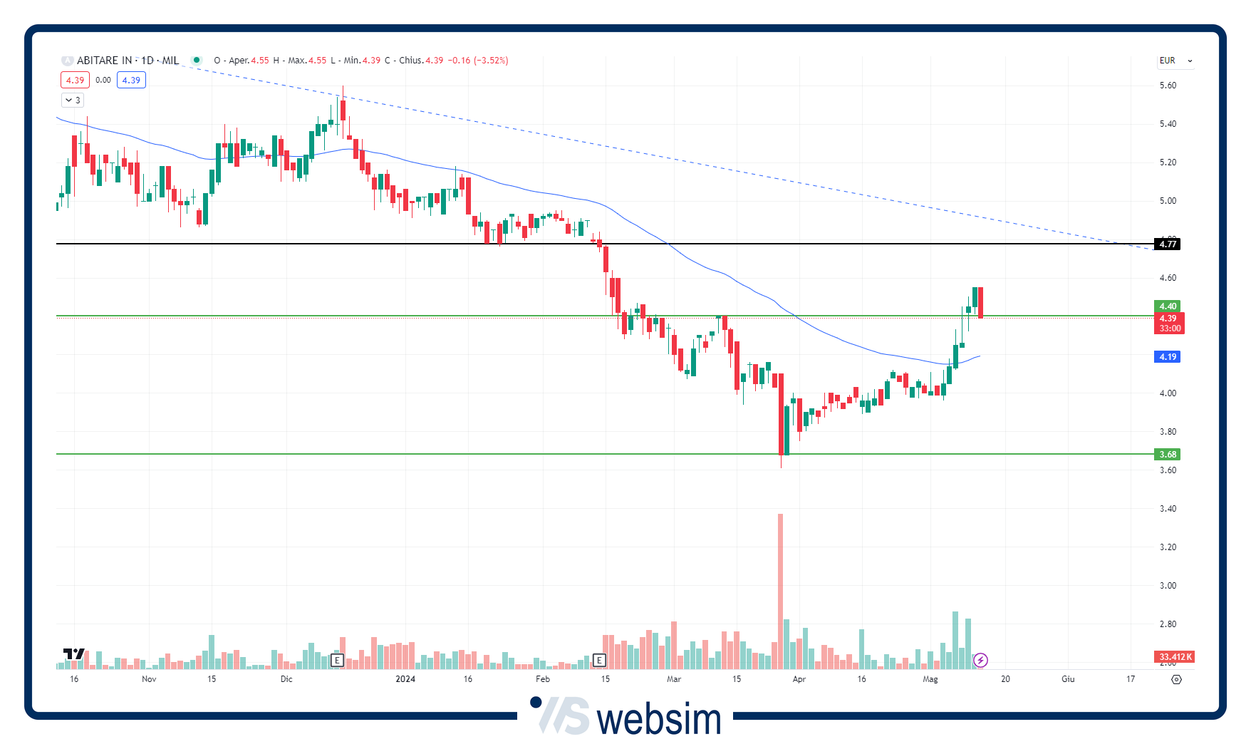 ABITARE IN [ABIT.MI] (4,4 eu, Long da 4,2 eu) -3%. Seduta di consolidamento dopo i recenti acquisti. Il titolo dopo esser rimbalzato dall'area supportiva dei 4 euro ad azione si è riportato al di sopra della media a 100 giorni, che transita ora in area 4,4 eu. In caso di proseguimento della forza, un breakout confermato anche da buoni volumi di negoziazione dei 4,6 eu potrebbe favorire un allungo verso l'area dei 4,8 eu. Nonostante dai minimi di marzo evidenzi un progresso di oltre 24%, la tendenza da novembre 2021 rimane debole, ma i recenti acquisti hanno dato ulteriore conferma della solidità dell'area supportiva a quota 4 eu. Continuare a seguire la strategia.