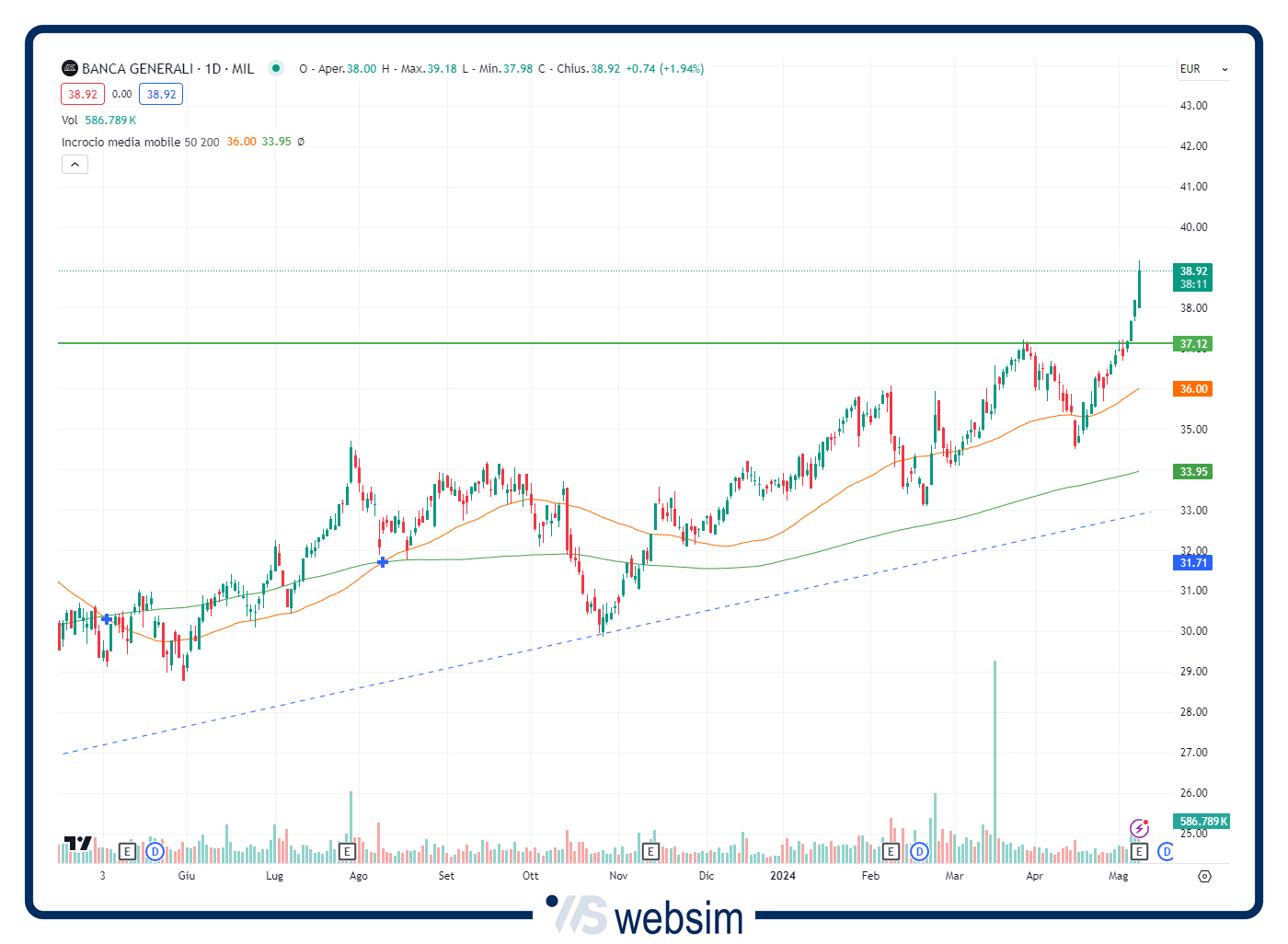BANCA GENERALI [BGN.MI] (38,9 eu, Long da 35,3 eu) +1,94%. Ottima seduta con il mercato che reagisce bene ai conti del primo trimestre. In particolare, il gruppo ha archiviato i primi tre mesi dell'anno con una crescita dell'utile netto del 47% a 122 milioni. Dal punto di vista grafico, con una partenza sprint (gap up) ha rotto al rialzo l'area di resistenza tra 36,8 eu e 37,2 eu, giungendo fino ad oltre 38,9 eu. Rimaniamo in posizione nonostante i prezzi si stiano avvicinando rapidamente ad una nostra area target.