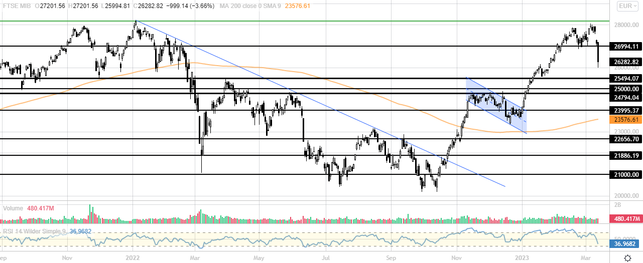 FTSE MIB (26.182 punti, -4%). La volatilità è arrivata tutta d'un colpo. I 27.000 punti sono stati infranti e l'indice passa subito al test dei 26.000 punti. Supporto importante. Importante guardare la chiusura di oggi in termini di prezzo e volumi.