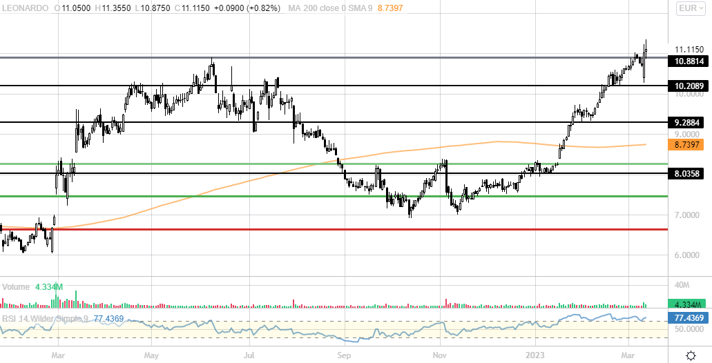 LEONARDO [LDOF.MI] (11,08 eu) +0,5%. Con forte volatilità e volumi si porta al test della resistenza importante degli 11 eu. Oggi sovraperforma con forza. Comprare.