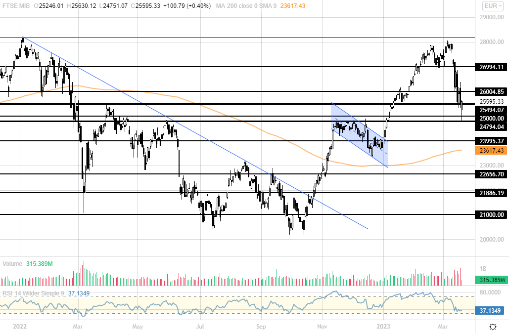 FTSE MIB (25.775,4 punti, +1%). L'indice italiano in apertura oggi ha testato la fascia di prezzo supportiva chiave dei 25.000 punti. La candela che si sta generando potrebbe anche portare un po' di rimbalzo ma saranno da vedere i volumi generati in chiusura e poi l'eventuale conferma nella seduta successiva. Un break in chiusura dei 25.000 punti invece darebbe un segnale di debolezza importante.