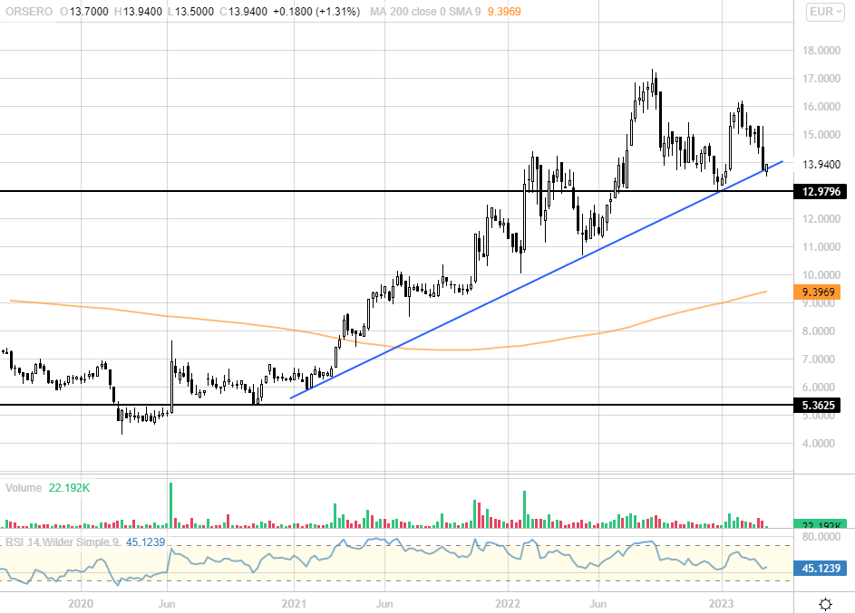 ORSERO [ORSO.MI] (13,9 eu, Long da 14,5 eu) +0,11%. Dai minimi di maggio 2020 ha avviato un trend rialzista molto forte più volte confermato dal test della trend line ascendente. I corsi ora si trovano a testare nuovamente il supporto dinamico. Si compra anche in caso di cali fino a 13 eu.