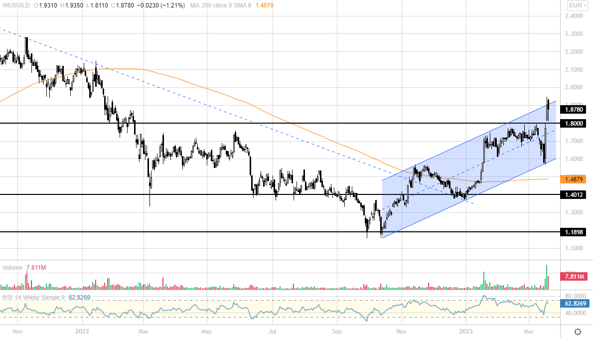 WEBUILD [WBD.MI] (1,88 eu, Long da 1,8 eu) -1,2%. Dai minimi di metà ottobre il titolo prosegue lungo un canale rialzista ben delineato. Molto positiva la rottura con forte volatilità e volumi della resistenza a 1,8 eu. A questi prezzi e su ritracciamenti a 1,8 eu si compra.