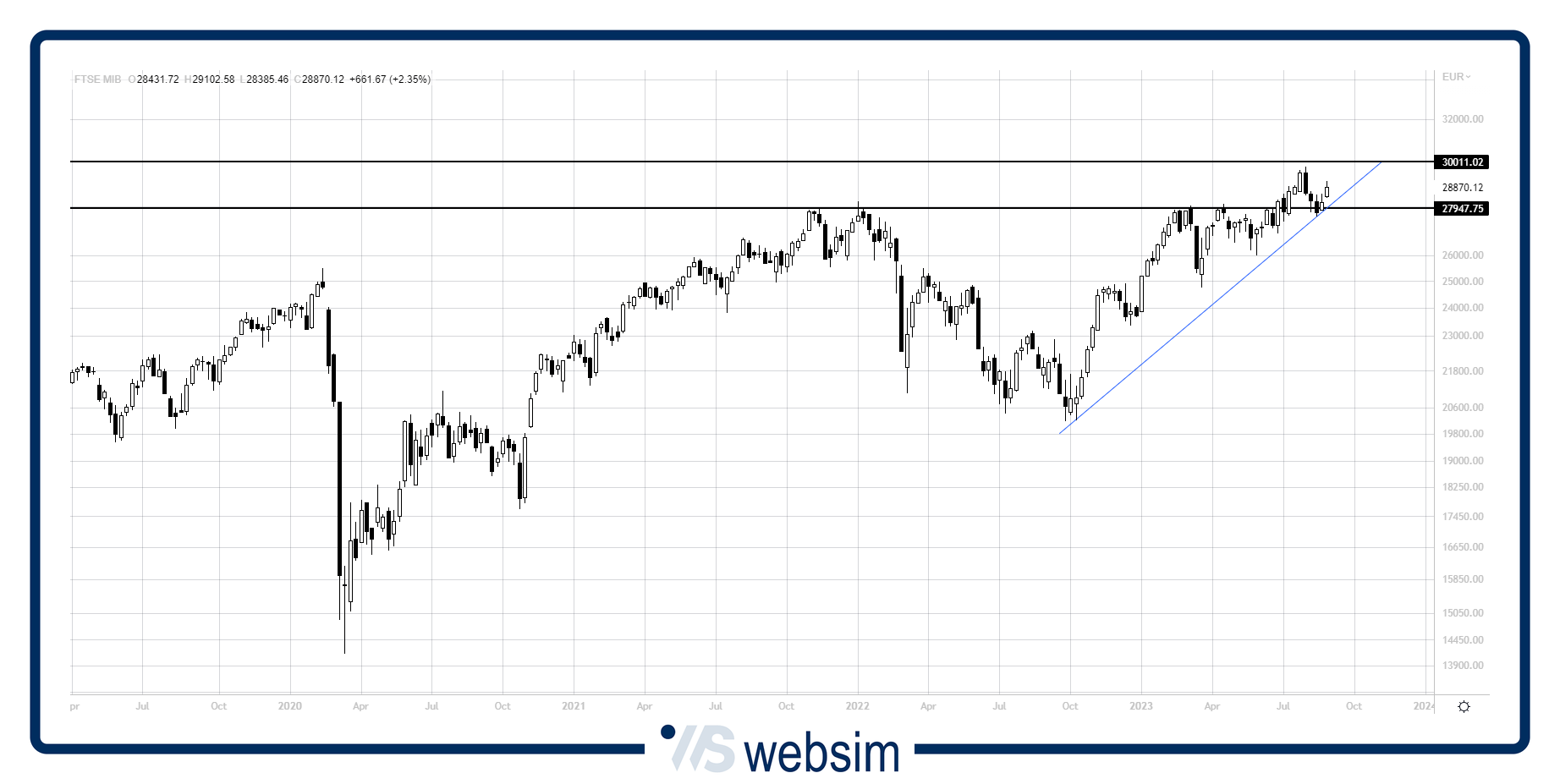 FTSE MIB (28.881,90 punti, -0,03%). Si fa sentire la resistenza dei 29.000 punti. Per tornare in zona 30mila punti, e soprattutto per avere l'ambizione concreta di superarla, serve l'aiuto degli indici "core" europei (Dax, Eurostoxx50 e Stoxx600), ancora piuttosto ingolfati, e di Wall Street che finora "batte in testa". Comunque, la tendenza di fondo rimane rialzista.