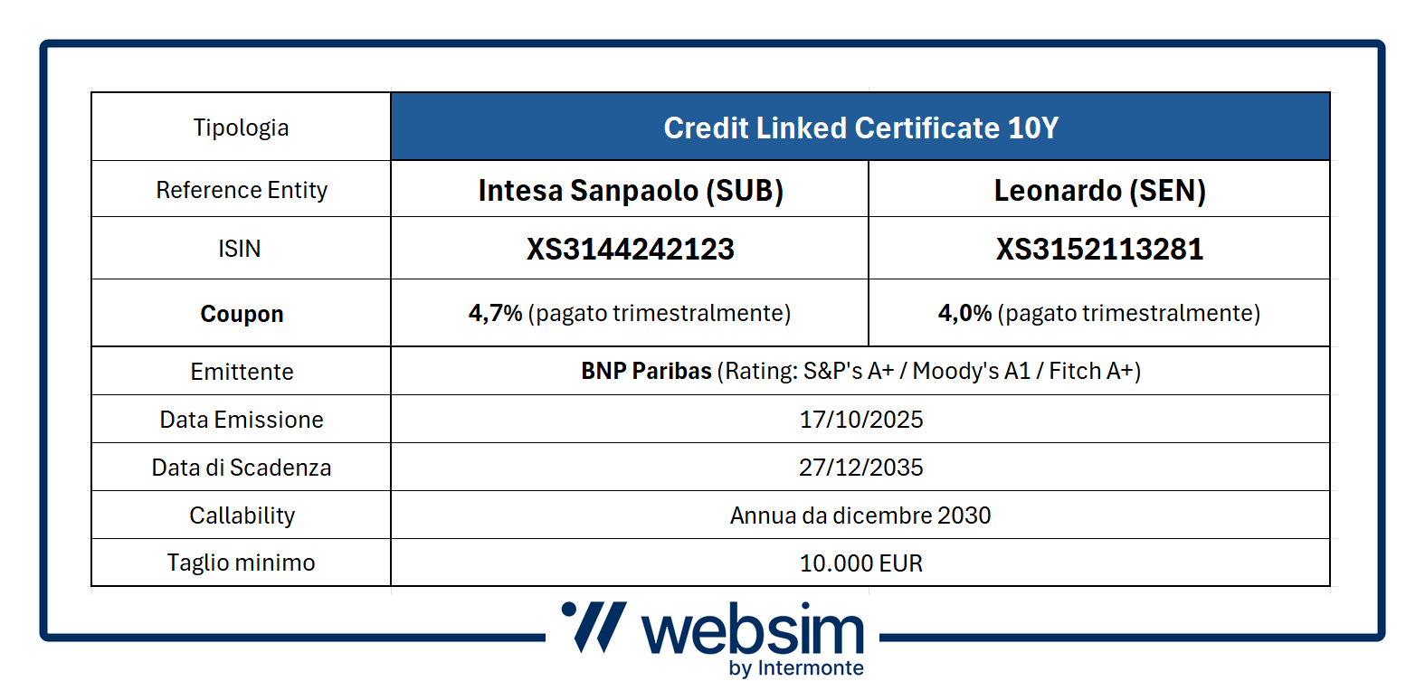 Due nuove Credit Linked di BNP su Leonardo (SEN) con ISIN XS3152113281 e Intesa Sanpaolo (SUB) con ISIN XS3144242123. Cedole incondizionate trimestrali (redditi diversi) del 4% annuo e del 4,7% annuo