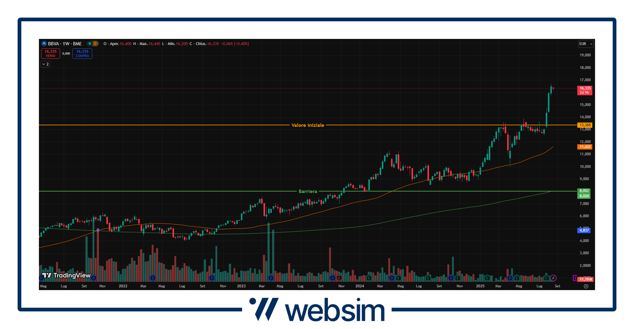 La banca spagnola è al centro dell’attenzione ormai da diversi mesi. Se infatti da un lato tengono ancora banco le discussioni sui possibili scenari di M&A, che la vedono come protagonista assoluta verso Sabadell, dall’altra è difficile non notare la brillante performance messa a registro nell’anno in corso (+73% circa), che da seguito ad un trend rialzista ormai iniziato da diversi anni sia per BBVA che per il settore in generale. Il titolo scambia attualmente in area 16,33 EUR, con un valore iniziale fissato a 13,365 EUR ed una barriera, come detto valida sia per coupon che per capitale a scadenza, a 8,019 EUR.