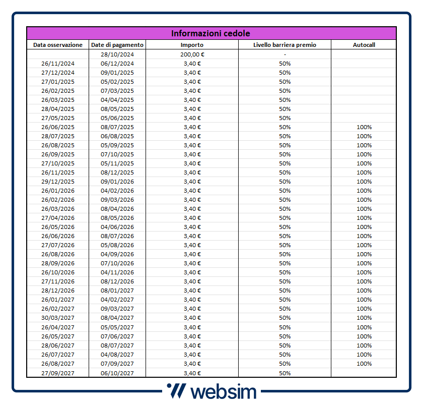 Per il rimborso del capitale, alla scadenza naturale del 6 ottobre 2027 sarà osservato il rispetto di una barriera al 50% (come per i premi mensili). In tal senso, se tutti e tre i titoli si presenteranno alla data di osservazione finale con una quotazione sopra il 50% del loro valore iniziale (strike), allora l’investitore riceverà l’intero capitale di 1.000 euro, insieme a tutte le cedole non ancora pagate grazie all'effetto memoria.