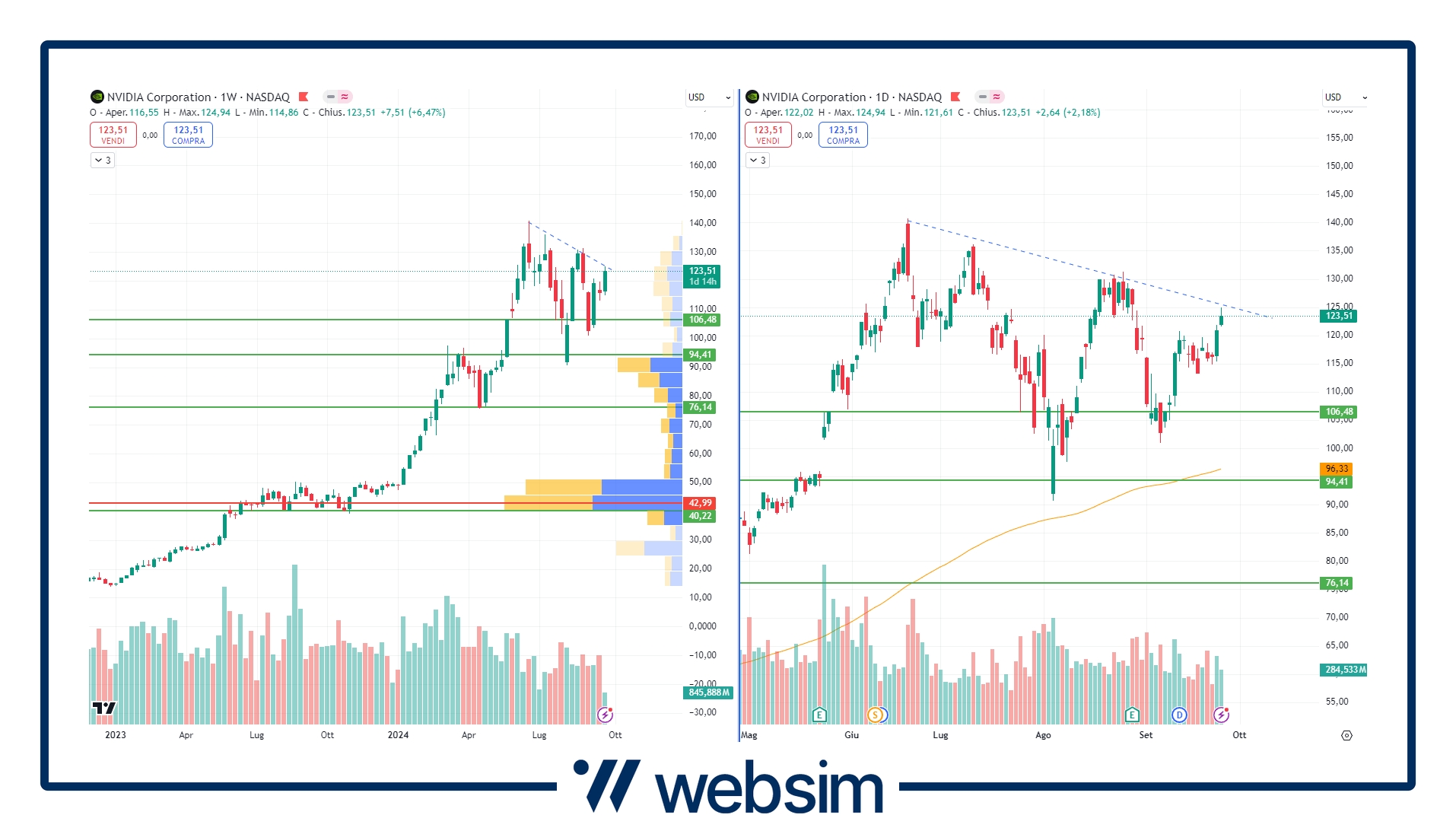 La cavalcata al rialzo di Nvidia è ben visibile nei grafici qui sotto, dove possiamo vedere i principali supporti e resistenze su time frame settimanale (a sinistra) e giornaliero (a destra).