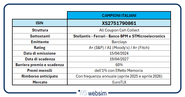 La nuova serie di Cash Collect All Coupon ideata da Intermonte ed emessa da Barclays offre però qualcosa in più: la possibilità di guadagnare anticipatamente quanto previsto anche se lo strumento viene ritirato anticipatamente dall'emittente. L’ultimo nato di questa nuova gamma è l’All Coupon Cash Collect con ISIN XS2751790861 che punta su quattro azioni fra le più brillanti e amate del Ftse Mib, vale a dire Stellantis, Ferrari, Banco BPM e STMicroelectronics.