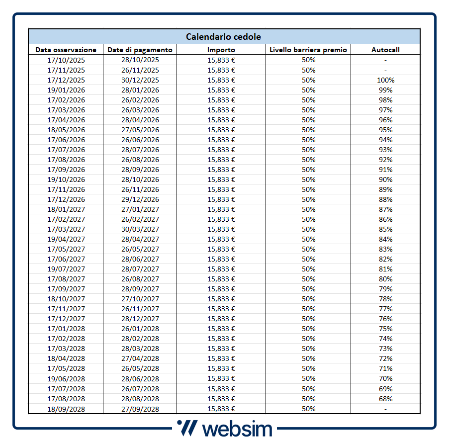 Come vediamo dalla tabella (qui sotto), il certificato ISIN IT0006770462 pagherà la sua prima cedola mensile il 28 ottobre, con data di osservazione prevista per il 17 ottobre.