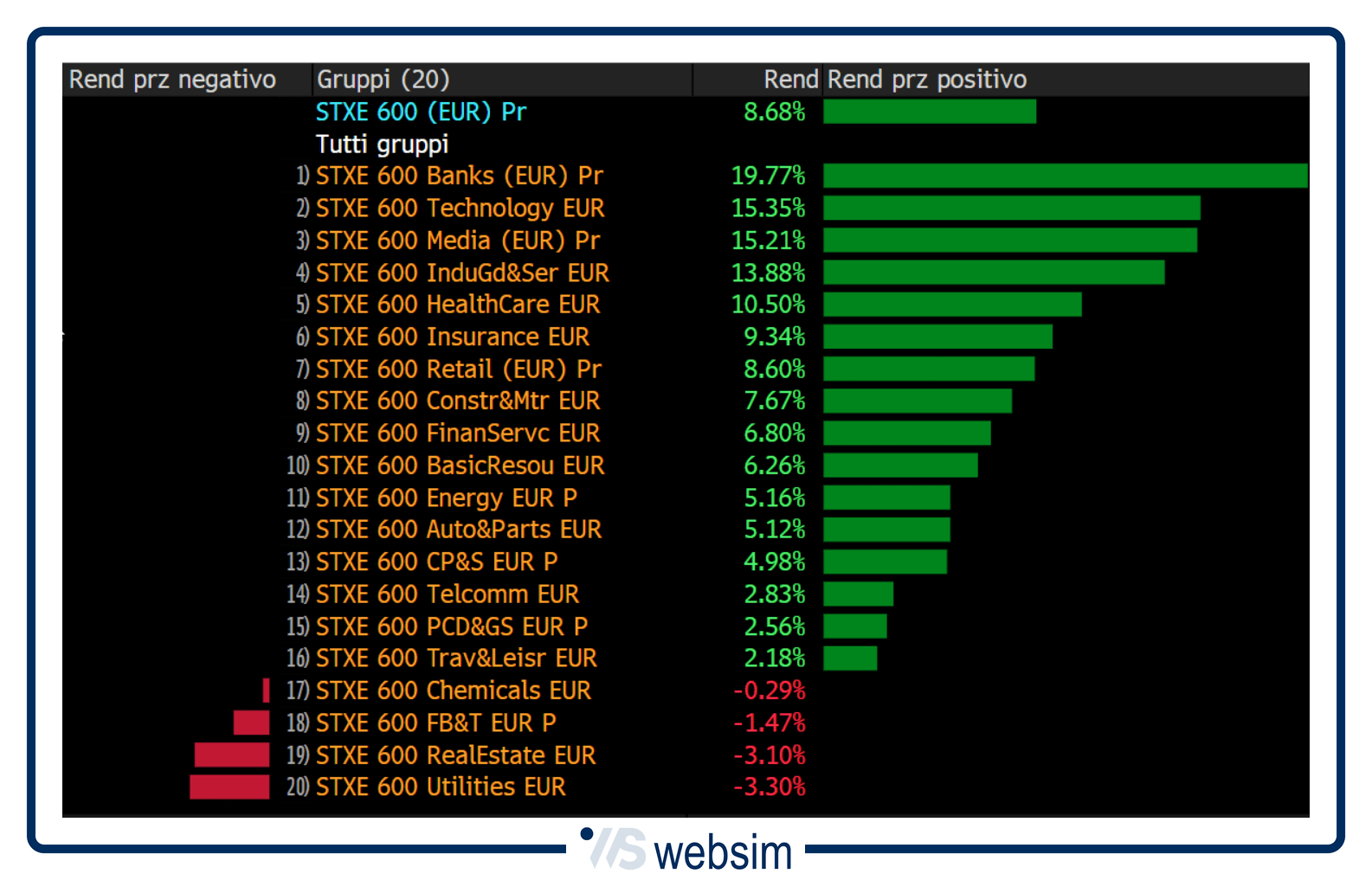 La banche italiane ed europee hanno già portato a casa performance veramente invidiabili. Il grafico sotto lo evidenzia molto bene. Con circa un +20% da inizio anno, la sovraperformance sul benchmark (Stoxx Europe 600) è enorme. Il primato quindi YTD è tutto del comparto bancario.