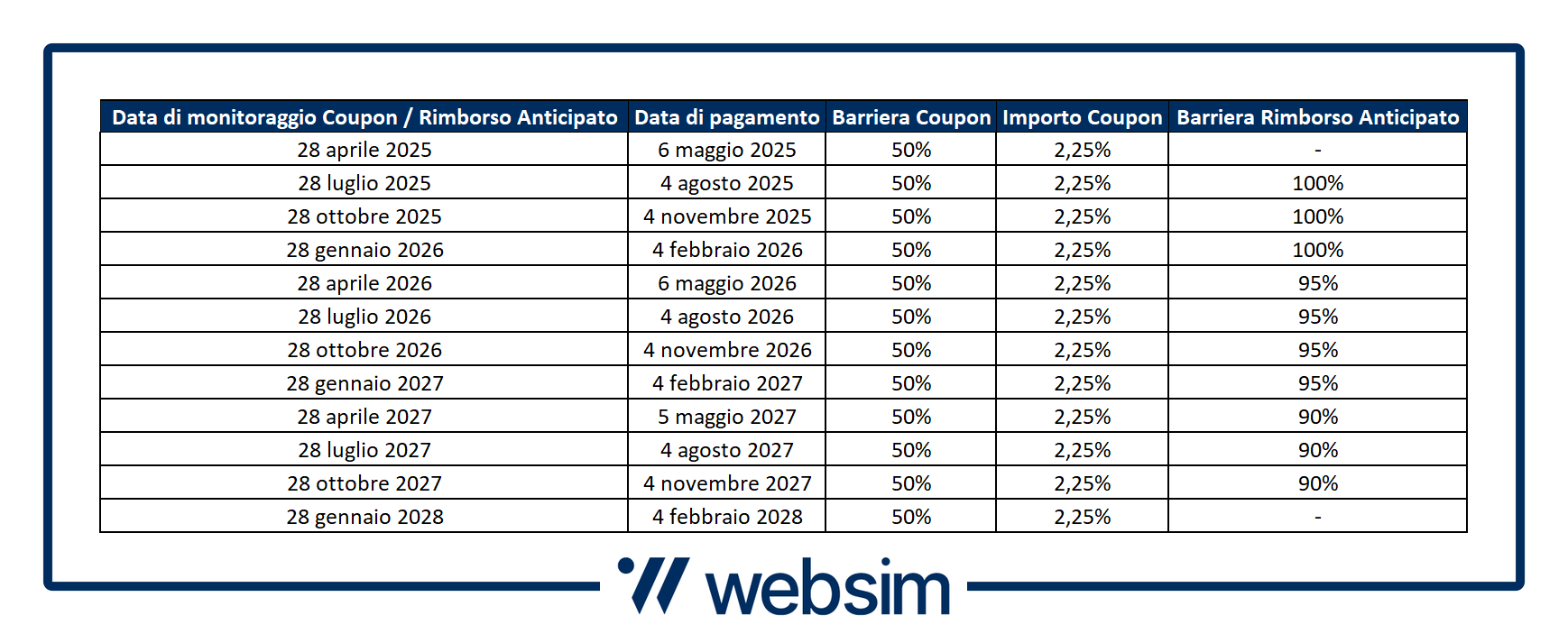 A partire da luglio 2025, ed a seguire alle stesse date di osservazione per il pagamento dei coupon, il certificato avrà anche la possibilità di essere richiamato anticipatamente. Tramite il meccanismo di Autocall se infatti ad una di queste date tutti i sottostanti verranno osservati con dei prezzi pari o superiori ai rispettivi trigger di rimborso anticipato, il certificato verrà rimborsato anticipatamente al valore nominale, a cui aggiungere ovviamente la precedente discussa cedola. I trigger di Autocall previsti partono dal 100% dei propri valori iniziali per poi decrescere, di -5%, fino ad assestarsi al 90%.
