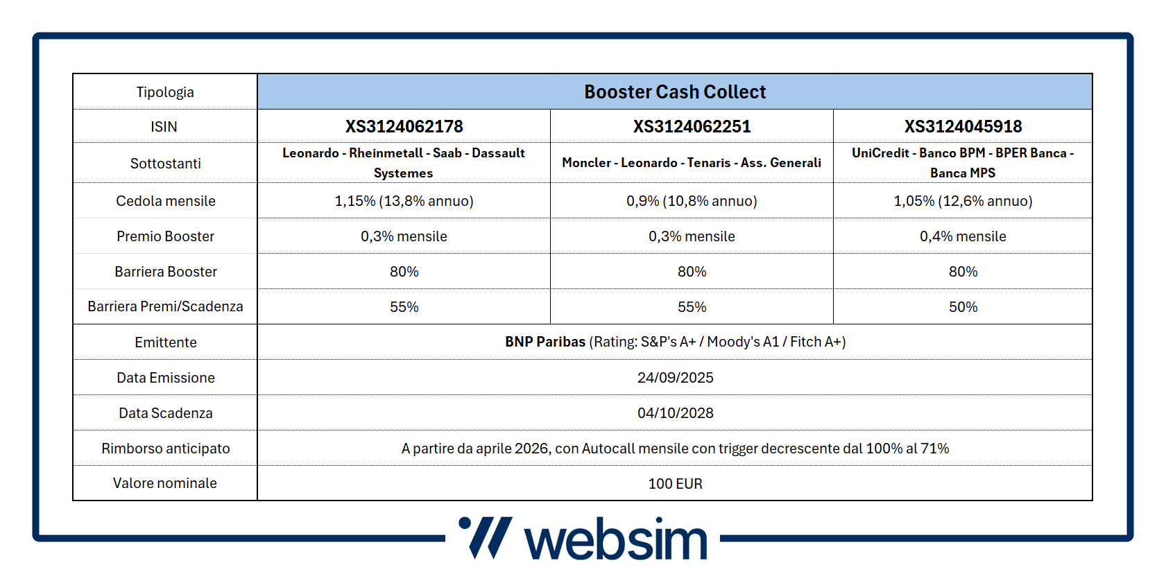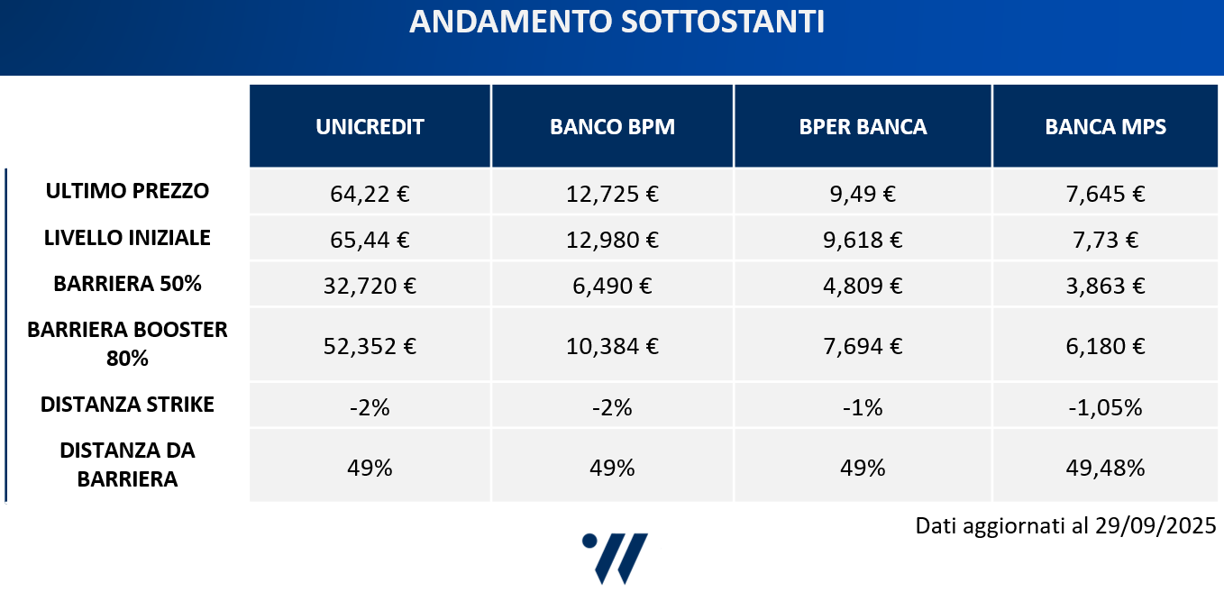 Il basket worst of ha come sottostanti UniCredit, Banco BPM, BPER Banca e Banca MPS. I premi mensili sono dell'1,05% (12,6% annuo), mentre in quest'ultimo caso il Premio Booster sale allo 0,4% al mese (premio Booster iniziale del 2,4%). Si punta quindi ad incassare un premio mensile dell'1,45% (17,4% annuo) in caso di rispetto, nei primi sei mesi di vita, della barriera Booster sempre all'80%. Dopo i primi sei premi mensili incondizionati dell'1,05%, dal 7° mese in avanti, le cedole mensili con memoria sono condizionate al rispetto di una barriera premi al 50%, un livello di protezione profondo valido anche per il rimborso del capitale a scadenza.