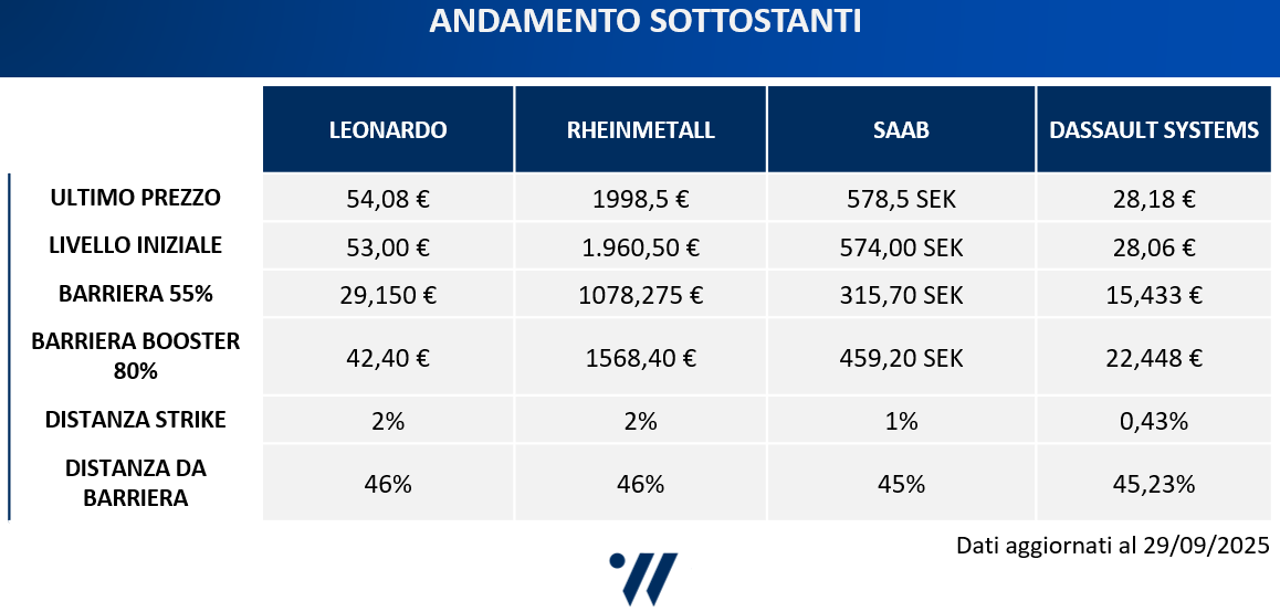 Il prodotto ha come sottostante il basket worst of composto da Leonardo, Rheinmetall, Saab e Dassault Systemes. I premi mensili, incondizionati nei primi sei mesi e condizionati con memoria in seguito, ammontano all'1,15%, ovvero il 13,8% di rendimento annuo.