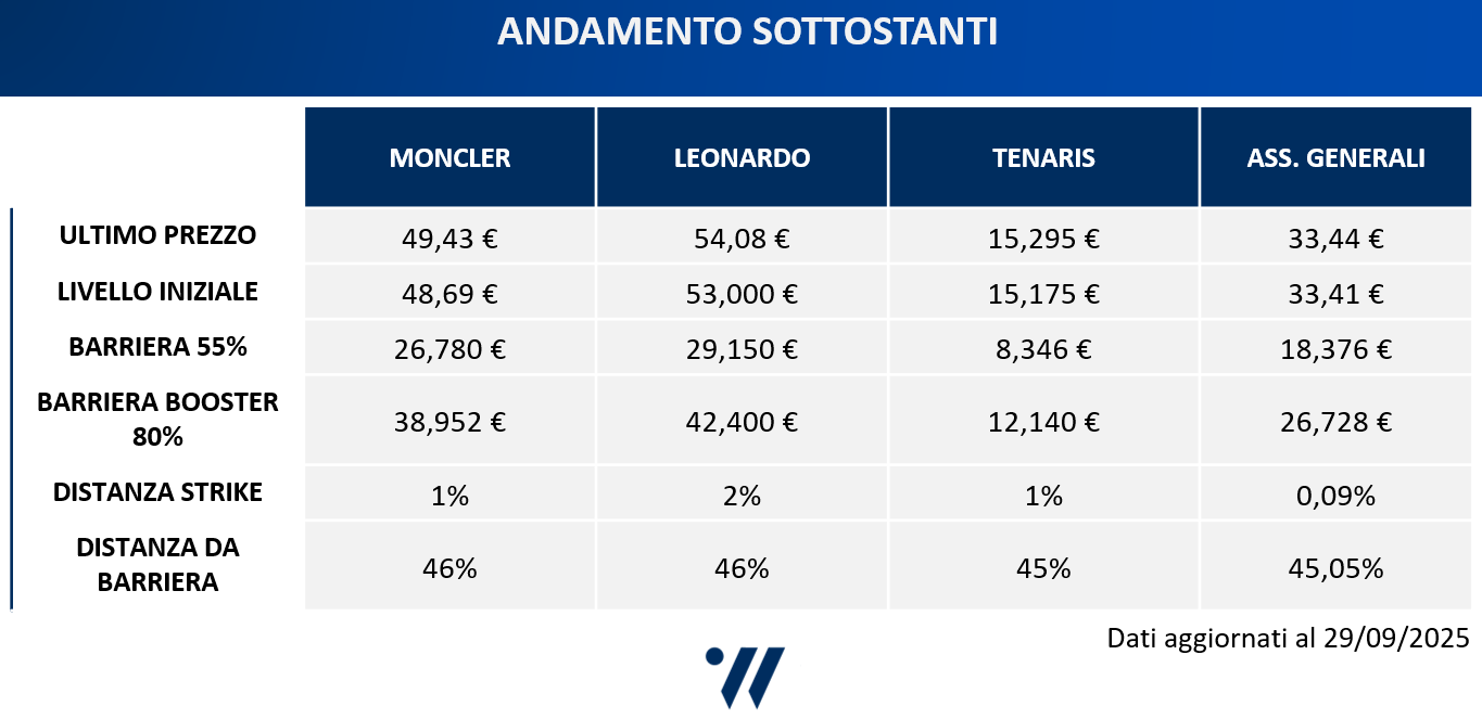 I sottostanti del paniere sono infatti: Moncler, Leonardo, Tenaris e Generali Assicurazioni. I premi mensili sono dello 0,9% (10,8% annuo), mentre anche in questo caso il premio Booster è dello 0,3% mensile (Premio Booster iniziale dell'1,8%). Si punta quindi ad incassare un premio mensile dell'1,2% (14,4% annuo) in caso di tenuta, nei primi sei mesi di vita, della barriera Booster all'80%. Dopo i primi sei premi mensili incondizionati dello 0,9%, dal 7° mese in poi, le cedole mensili con memoria dello 0,9% (o dell'1,2% se viene attivato l'Effetto Booster) sono condizionate al rispetto di una barriera premi al 55%, valida anche a protezione del capitale a scadenza.