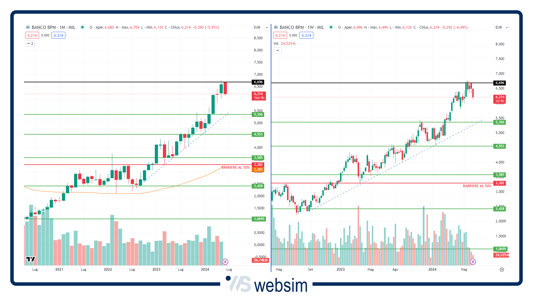 Come dicevamo, ottimi risultati anche in Borsa con il titolo che, prima delle prese di beneficio post elezioni europee, è arrivato a toccare i massimi dal gennaio 2016, mettendo così a segno un vigoroso rimbalzo di oltre il +450% dai minimi del 2020 (+60% nell'ultimo anno). Questo è ben visibile dal grafico qui sotto che mostra l'andamento su time frame mensile sul lato di sinistra, mentre a destra è raffigurato su scala settimanale. Le barriere a scadenza e per l'ottenimento dei premi su Banco BPM si trova a quota 3,302 euro un livello distante circa il 47% dai livelli attuali e che, come vediamo dal grafico qui sotto, si trova al di sotto delle tre aree supportive a quota 5,36 euro, 4,55 euro e 3,5 euro.