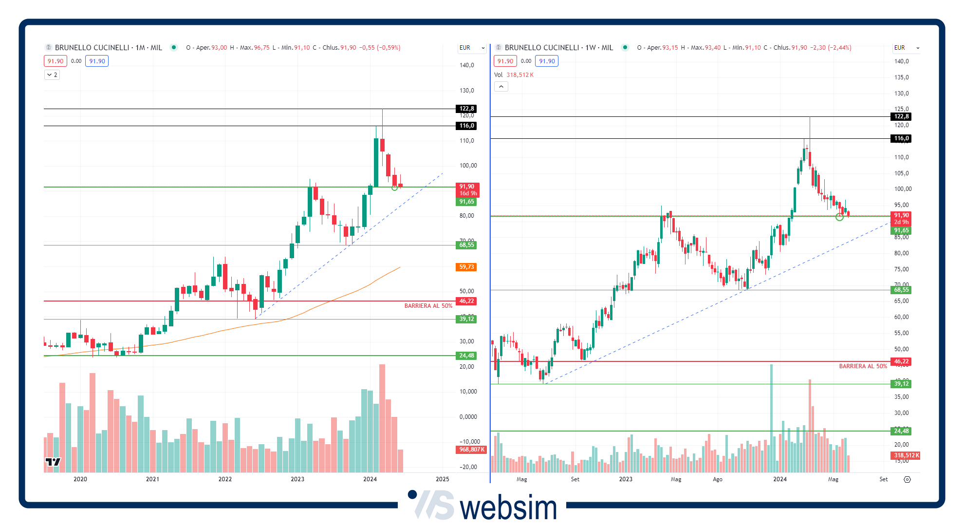 Numeri che si riflettono in un andamento positivo anche a Piazza Affari con il titolo che, dopo aver toccato un nuovo massimo storico a marzo di quest'anno, ha ritracciato, anche se da questo punto di vista l'area supportiva a quota 90 euro potrebbe sostenere i prezzi favorendo un rimbalzo in grado di riportare i prezzi sopra i 100 euro. Anche in questo caso la barriera al 50% su Brunello Cucinelli dà una certa tranquillità all'investitore dato che si trova poco sopra a 3 euro, area di prezzo sotto le principali aree di supporto prima a 90 euro e poi verso i 70-68 euro ad azione.