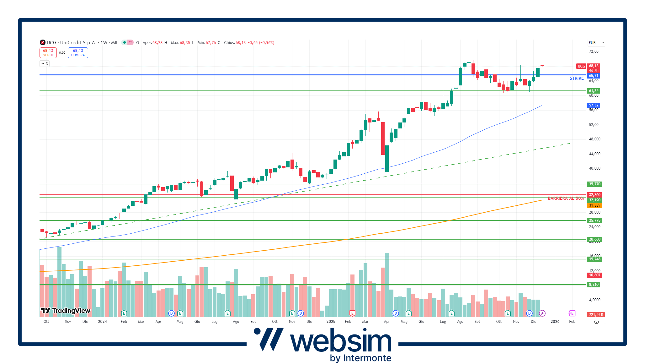 Uno dei punti di forza di questo certificato è la bassa volatilità implicita dei sottostanti: Enel (16,84%), Eni (18,15%) e Intesa Sanpaolo (23,87%) si collocano su livelli moderati, mentre UniCredit (29,64%) è leggermente più alta ma bilanciata dagli altri titoli. Questo significa minore rischio di oscillazioni estreme, elemento chiave per strategie di investimento orientate alla stabilità.