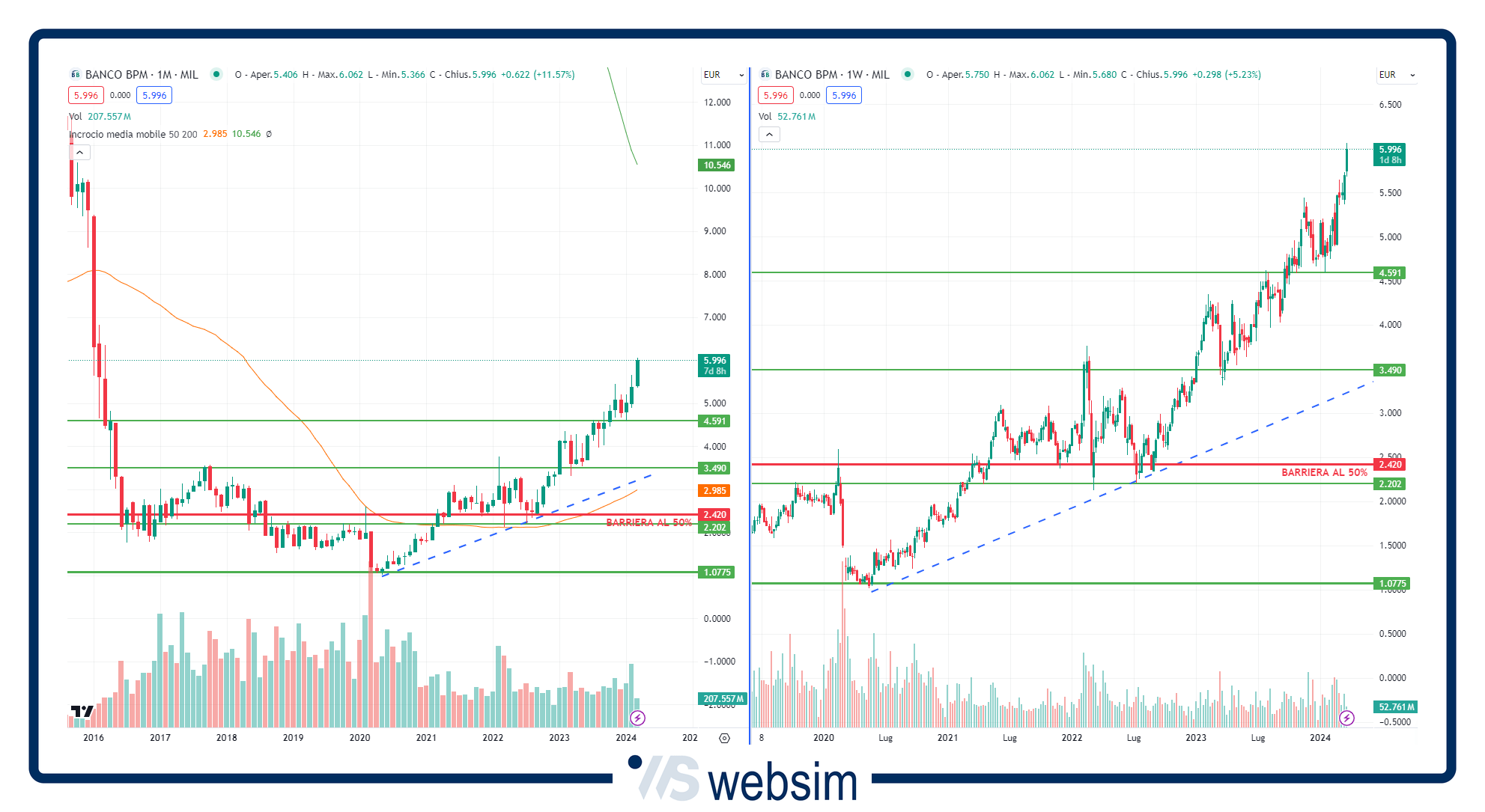 Anche Banco BPM continua a regalare soddisfazioni agli investitori, con il titolo che nell'ultimo anno ha guadagnato il 60%, +25% da inizio 2024. Il titolo, grazie agli acquisti degli ultimi mesi si è riportato sui livelli più alti dal 2016 e in caso di prosecuzione degli acquisti la successiva area di resistenza si trova, oltre che in area 6 euro verso i 6,5 euro. Anche in questo caso, come vediamo dai grafici qui sotto (a sinistra su time frame mensile, mentre a destra quello settimanale), appare strategico il posizionamento della barriera al 50% che si trova a 2,418 euro. Si tratta di un livello molto distante dai prezzi attuali (area 6 euro) e che si trova al di sotto di diverse ed importanti aree di supporto: 4,5 euro e 3,4 euro.