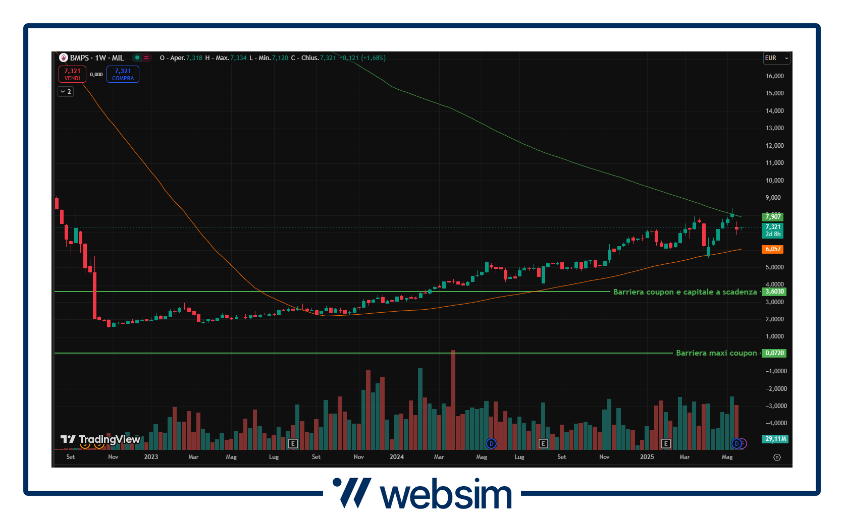 L’istituto senese è ormai da diversi anni al centro di molte discussioni, ma quello che ha caratterizzato ormai l’ultimo anno è stato lo switch della banca da un ruolo di possibile target ad acquirente. In tutto questo i risultati continuano a sostenere la qualità e solidità del trend che la caratterizza da ormai diverso tempo, da segnalare infatti in ordine temporale i dati comunicati per il 1Q25 sopra le attese grazie ai profitti migliorati lato trading ed i minori costi. Il titolo quota attualmente in area 7,312 EUR con le due barriere previste a 3,603 EUR (coupon e capitale a scadenza) e 0,072 EUR (maxi coupon iniziale).