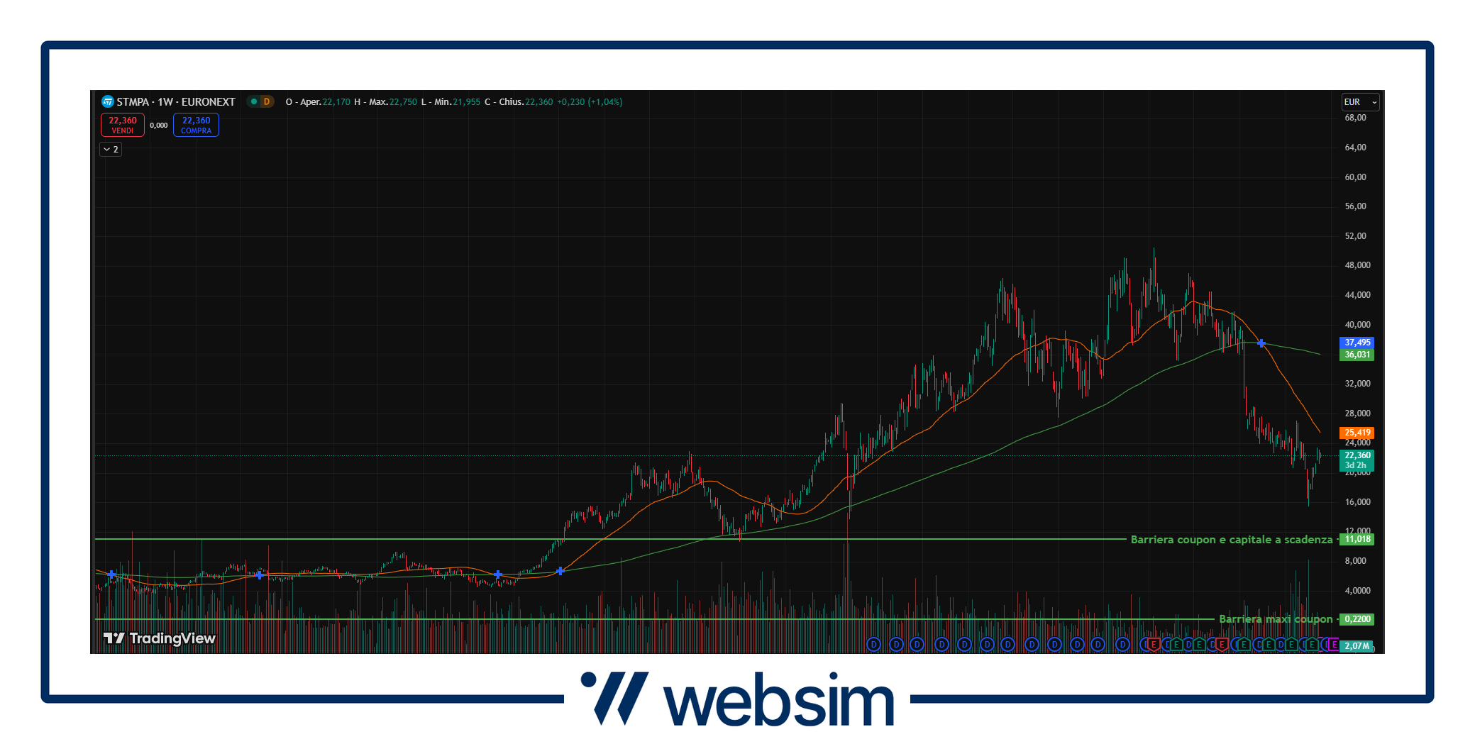 L’azienda di semiconduttori ha iniziato in salita l’anno in corso, complice soprattutto un equilibrio macro economico più che incerto, che ha influenzato più o meno tutti i settori, e la debolezza della domanda nei settori Automotive e Industriale. Ciononostante, va sottolineato che i dati comunicati per il primo trimestre 2025 hanno fatto registrare performance sostanzialmente in linea con quelle che erano le attese di mercato, con la dirigenza che ha confermato l’aspettativa di un miglioramento nella seconda metà dell’anno, ma continuando a non fornire previsioni dettagliate per l’intero esercizio 2025 a causa della visibilità ancora limitata sul contesto macroeconomico. Il titolo quota attualmente in area 22,40 EUR con le due barriere previste a 11,017 EUR (coupon e capitale a scadenza) e 0,22 EUR (maxi coupon iniziale).