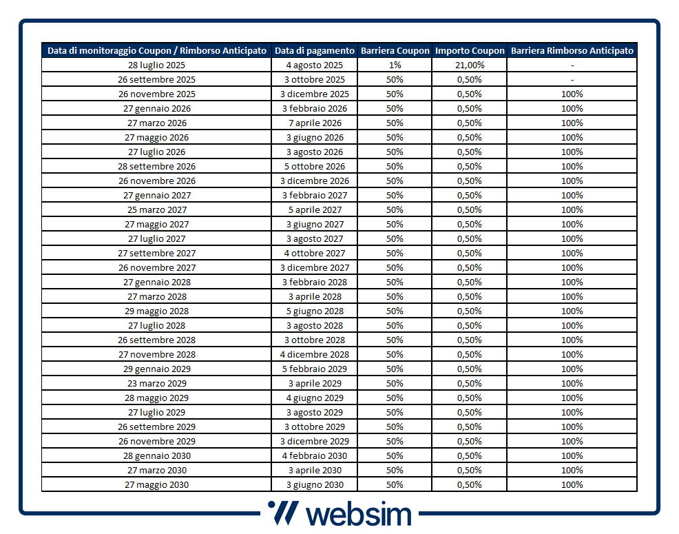 Il certificato ha una durata prevista di cinque anni, con possibilità di richiamo anticipato a partire dal sesto mese (novembre 2025). Grazie al meccanismo di Autocall, infatti, se in una qualsiasi data di osservazione prevista tutti e tre i sottostanti risultano sopra i rispettivi livelli iniziali, il certificato sarà rimborsato anticipatamente, restituendo il valore nominale e includendo gli eventuali coupon rimasti in memoria.