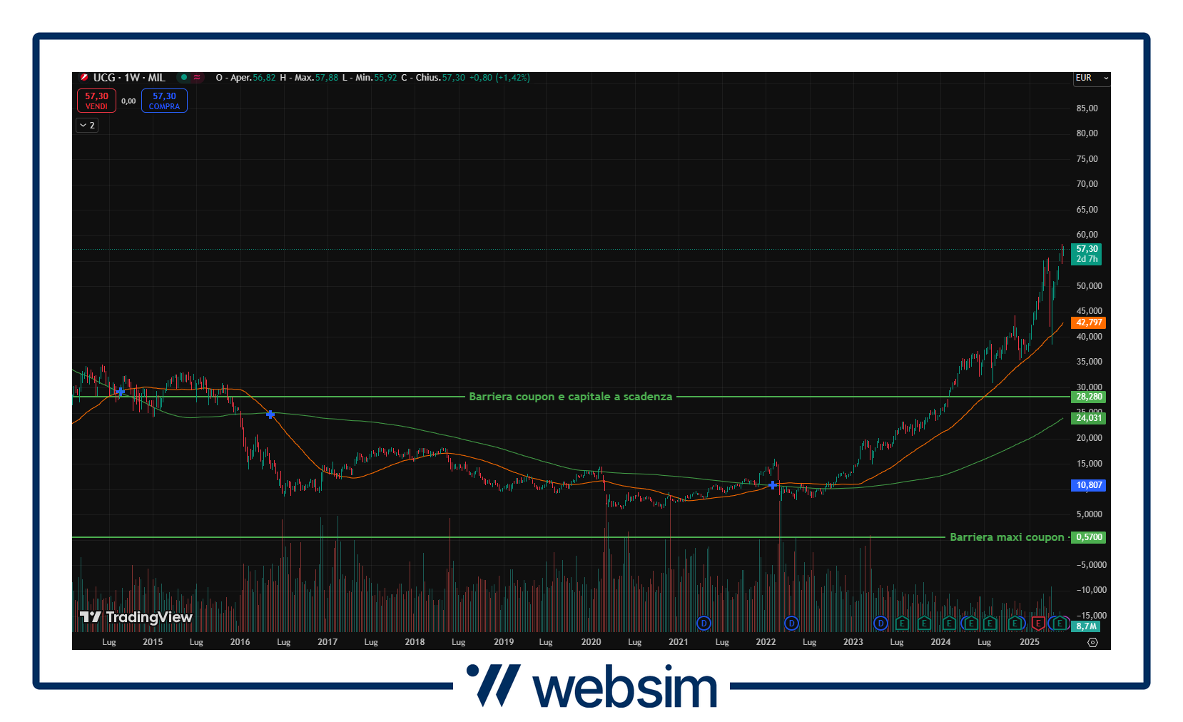 Nel 1Q25 il gruppo ha superato le aspettative sia per i ricavi che per gli utili. Solidi ricavi da commissioni derivanti da attività di investimento, finanziamento e copertura dei clienti hanno più che compensato il calo previsto del reddito da interesse netto, mentre i guadagni da negoziazione guidati dai clienti hanno superato comodamente le assunzioni della società per il 2025. Unicredit è stata al centro dei riflettori nell’ultimo periodo come assoluta protagonista dei possibili scenari di M&A che si stanno delineando nel panorama del settore italiano. A tal proposito ogni mossa risulta essere più che importante sotto questo punto di vista, come la notizia del possibile accordo con alcuni fondi d’investimento degli Emirati Arabi per la divisione russa di Unicredit, operazione che potrebbe favorire la revisione delle prescrizioni Golden Power e, di conseguenza, l’andamento dell’operazione BAMI. Il titolo quota attualmente in area 57,35 EUR con le due barriere previste a 28,28 EUR (coupon e capitale a scadenza) e 0,57 EUR (maxi coupon iniziale).