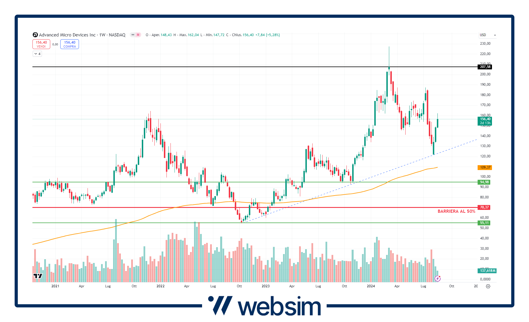 Ottimi anche gli ultimi conti trimestrali per AMD che ha archiviato il secondo trimestre dell'anno con un fatturato in aumento e oltre le attese a 5,83 miliardi di dollari (+9% anno su anno). Sopra le stime anche l'utile per azione che si è attestato a 0,69$. Per AMD, il segmento dei data center dell'azienda è stato il più performante, con un'impennata dei ricavi del 115% fino a raggiungere la cifra record di 2,8 miliardi di dollari. Ottimi spunti anche in termini di prospettici con il gruppo che stima un ulteriore crescita significativa dei ricavi nella seconda metà dell'anno. Il colosso prevede inoltre di continuare ad aumentare i suoi investimenti in hardware e software per sfruttare le opportunità nel mercato dell'intelligenza artificiale e la recente acquisizione di ZT System ne è la conferma.