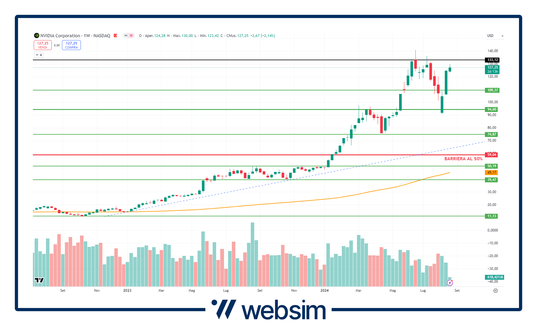 Buon andamento del titolo in borsa che nella seduta di ieri e dopo l'annuncio dell'acquisizione di ZT System, è balzato di oltre il 4,5%. Dai minimi di inizio agosto il titolo ha già guadagnato il +27% riportandosi al di sopra dell'area supportiva a 140$ e a -15% dai massimi di luglio di quest'anno.