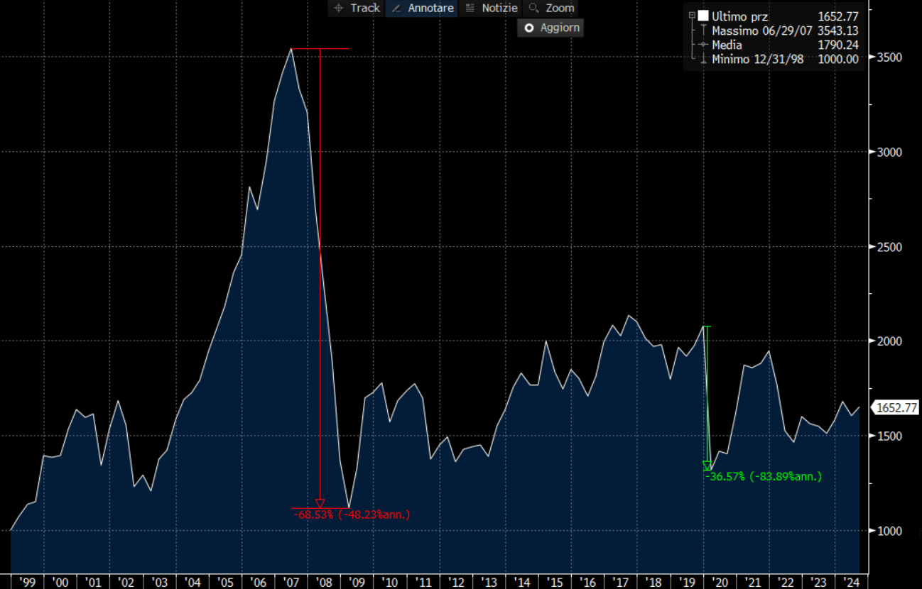 Lavorare sugli indici mette un po’ più di tranquillità, rispetto ai titoli, soprattutto per la presenza di una barriera al 60% che è abbastanza protettiva su questa tipologia di sottostante. Questo anche perché si parla di indici generali e non settoriali, più volatili sicuramente. Se prendiamo l’indice Euro Stoxx Select Dividend 30 e analizziamo dal 2000 l’andamento dell’indice notiamo che solo una volta nella grande crisi del 2008 l’indice ha perso molto più del 40%. In questi ultimi 24 anni poi non ha mai perso più del 40%. La barriera al 60% appare abbastanza protettiva per questo indice che non è sicuramente performante ed efficiente, ma che si sposa benissimo con un certificato. Infatti, si muove in lunghissime fasi laterali.