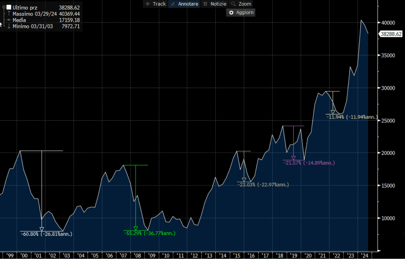 Sui quattro indici forse il più volatile e rischioso è il Nikkei 225 in questo momento. L’indice giapponese rimane comunque un indice molto efficiente tendenzialmente orientato al rialzo. Come si vede dal grafico anche il Nikkei 225 ha perso nel 2000 e 2008 ben più del 40%.