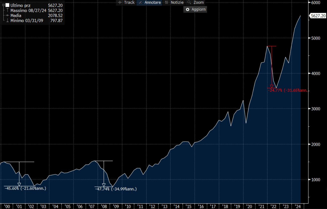 Discorso diverso per S&P 500 e Russell 2000, due tra gli indici americani più importanti, con big e small cap. Entrambi gli indici sono molto efficienti e nello stesso periodo di tempo, quindi dal 2000, il Russell 2000 ha segnato una perdita maggiore del 40% solo nella crisi del 2008, l’S&P 500 ha leggermente perso più del 40% nelle due grandi crisi finanziarie del dot.com, anni 2000, e poi nel 2008 di Lehman Brothers.