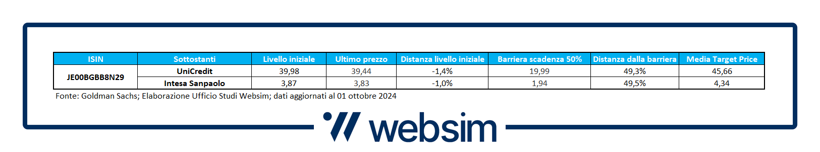 Ci riferiamo al certificato ISIN JE00BGBB8N29 del colosso americano che presenta un basket worst of su due soli sottostanti: UniCredit e Intesa Sanpaolo. Due tra le banche più solide in Europa e quindi al mondo visto gli alti standard regolamentari presenti in Europa. Il certificato paga premi trimestrali con memoria del 2,13% (8,52% annuo) condizionato ad una barriera posta al 50% degli strike (e valida anche a scadenza). Possibilità di rimborso anticipato da giugno 2025 con trigger al 100% degli strike, mentre la scadenza è attesa per ottobre 2027.
