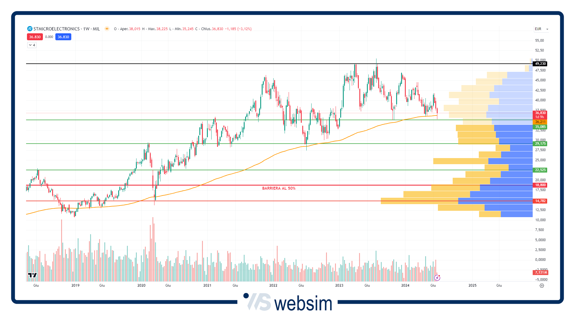 Prosegue la fase laterale di STMicroelectronics, gioiellino italo-francese tra i leader mondiali del mercato dei semiconduttori. Questo è evidente dal grafico riportato qui sotto su time frame settimanale, dove è ben visibile l'attuale area supportiva a 35 euro, livello avvalorato ulteriormente dal transito nei suoi pressi della media mobile a 200 settimane (linea arancione). Ecco che questi due livelli, uniti alle altre aree supportive, prima a quota 30 euro e poi più in basso verso i 22 euro, potrebbero sostenere efficacemente i prezzi in caso di uno storno di STM, difendendo così il suo livello barriera al 50% a 18,8 euro.