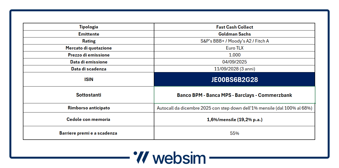 Da Goldman Sachs il nuovo Fast Cash Collect su banche europee con rendimento monstre: 1,6% mensile con memoria (19,2% annuo). Barriera 55% per premi e capitale.