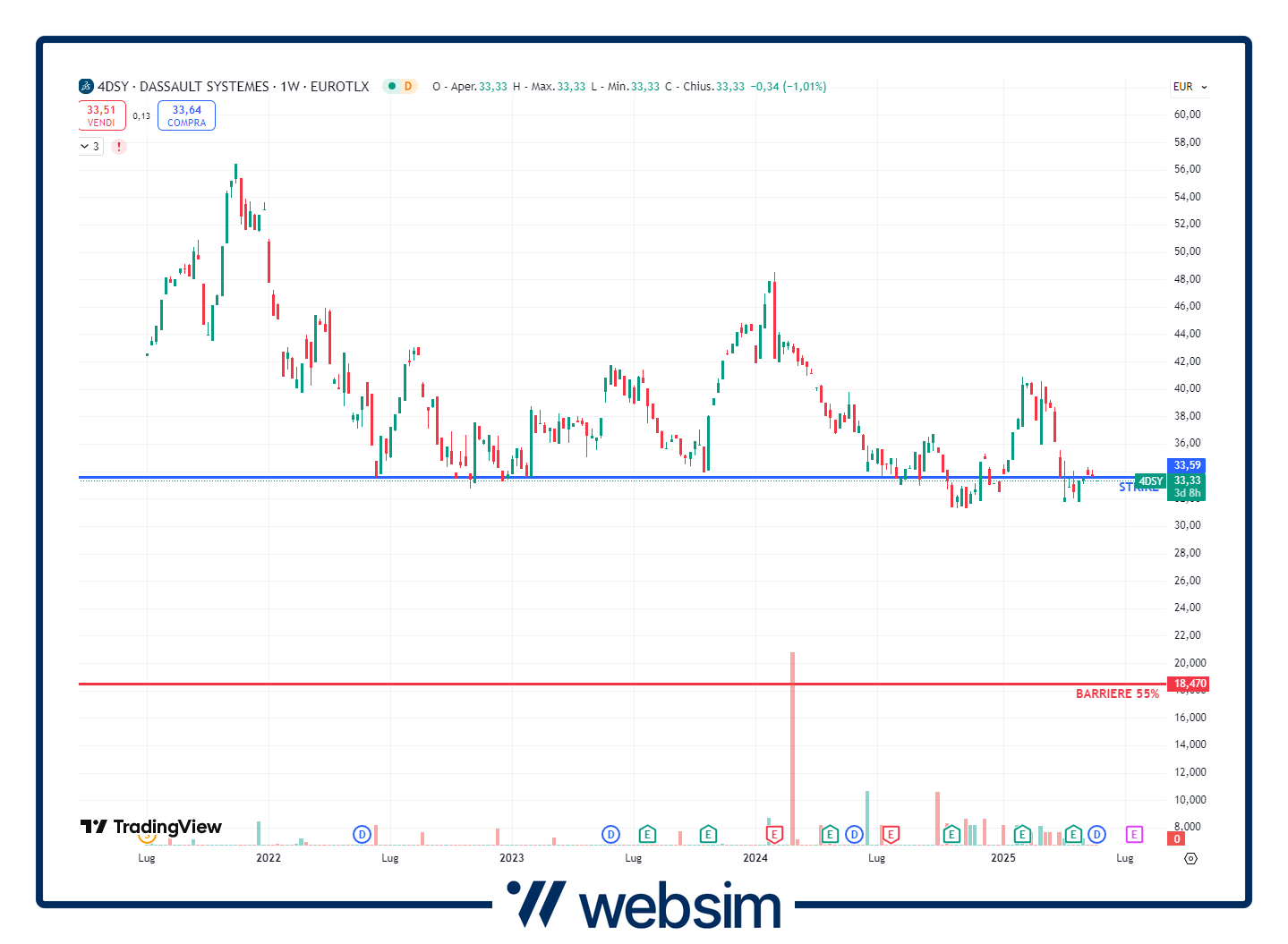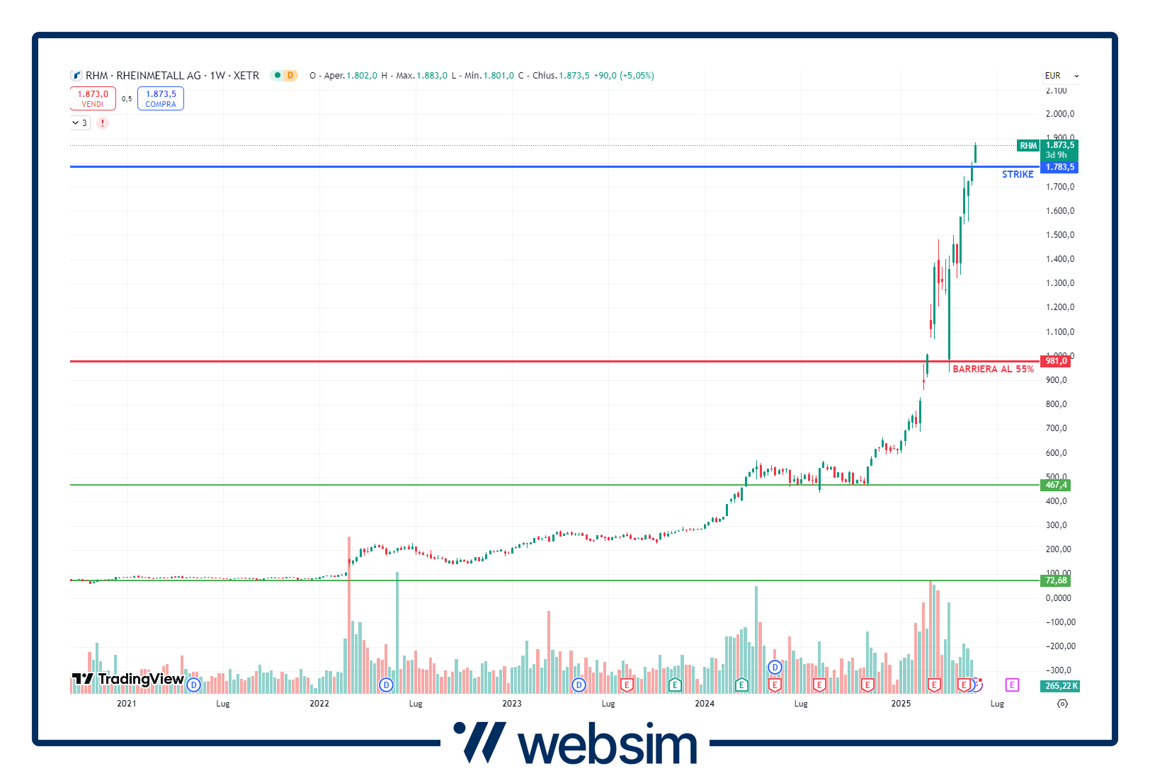 Come dicevamo, il certificato di oggi punta sul paniere worst-of composto dai quattro titoli della difesa europea. Stiamo infatti parlando dell'italiana Leonardo, della tedesca Rheinmetall, dell'inglese BAE Systems e della francese Dassault Systèmes. Andiamo ad analizzarli e a vedere sui grafici delle quotazioni dove si va a collocare il prezzo strike e la relative barriere di protezione al 55%.