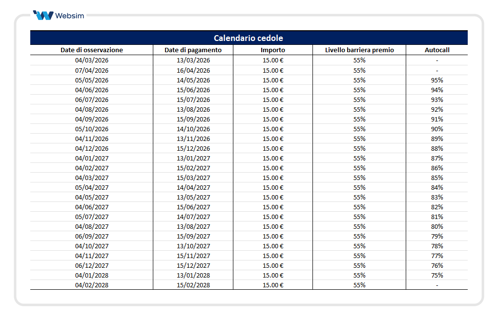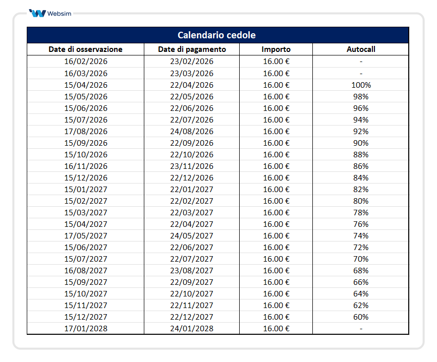 Il prodotto ha scadenza naturale fissata a febbraio 2028, ma potrebbe essere rimborsato anticipatamente grazie alla funzione di Autocall, attiva a partire da maggio 2026. La soglia di rimborso anticipato parte dal 95% per poi scendere progressivamente dell'1% al mese fino ad un livello del 75%.