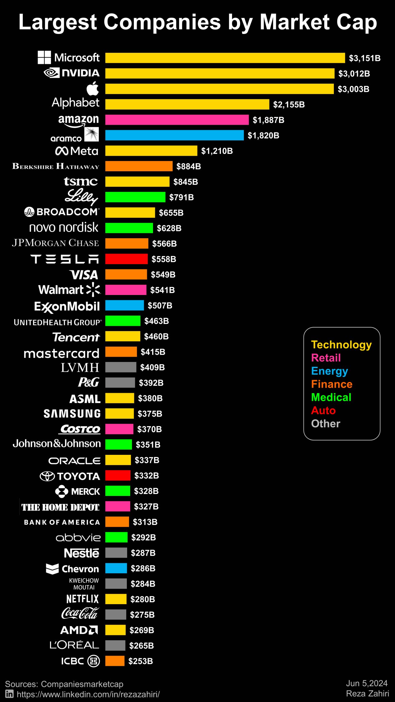 Il dominio dei titoli tech è reso ben evidente dal grafico qui a lato fornito da companiesmarketcap.com, dove troviamo la classifica delle prime società quotate al mondo divide anche per settori di appartenenza. Come vediamo le prime quattro posizioni dell'elenco sono occupate da titoli tecnologici (istogrammi gialli), con Microsoft, Nvidia, Apple e Google che dominano la scena.
